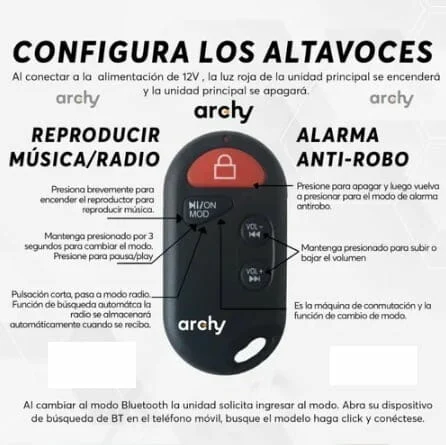 Bocina, amplificador y alarma de moto. Cuenta con estéreo y bluetooth, tarjeta sd, fm y usb.
