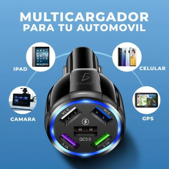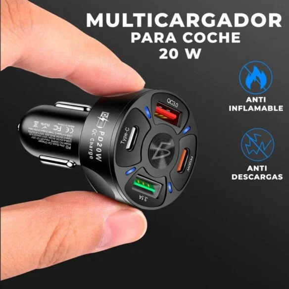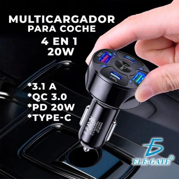 • Multicargador para automóvil con 4 puertos: 2 puertos USB de carga rápida y 2 puertos USB-C de carga rápida.